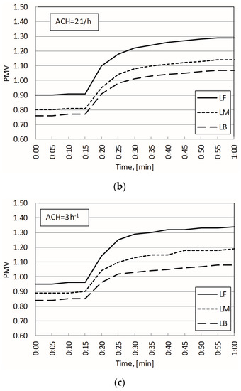 PMV values registered in the IEQ test room. (a) ACH=1 h−1. (b) ACH=2 h−1. (c) ACH=3 h−1.