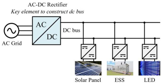 Nowadays, DC distribution systems are replacing conventional AC systems due to their outstanding features [1,2,3]. In the conventional AC system, AC-DC converters are required in every DC unit to be interfaced with the AC grid. However, in the case of the DC system, the DC units can be directly connected to the main DC bus without any AC-DC converters. Therefore, since the DC units, such as renewable energy sources, and DC loads are rapidly increasing in modern industries and residences, the utilization of the DC bus can bring much higher power density, cost-effectiveness, and power conversion efficiency than the conventional AC distribution system. In addition, the AC resistance, reactive power, and grid frequency do not exist in the DC distribution lines, which further improves the DC system in terms of the conduction losses and the control complexity.