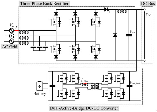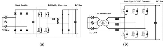 Figure 2 shows the conventional system configuration, which can step down the DC-link voltage from the AC grid voltage. In the case of Figure 2a, the diode rectifier and the full-bridge DC-DC converter [13] are used to configure a two-stage structure. The DC-link voltage is built up by the diode rectifier. Then, the full-bridge DC-DC converter steps down the DC voltage level. In the case of Figure 2b, the line-frequency transformer and the boost-type AC-DC rectifier [4,5,6,7,8] are used. Since the boost-type AC-DC rectifier cannot step down the voltage level, the line-frequency transformer is connected to the grid for stepping down the AC grid voltage. Consequently, the conventional systems require multiple power conversion stages and bulky line-frequency transformers, which degrade their power density and cost-effectiveness. In addition, those systems include the voltage-fed bridge-based topologies, which induce shoot-through problems in the arm switches. In addition, in the case of the diode rectifier, the power factor and THD become poor.