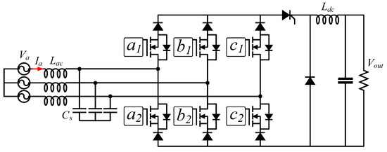 Figure 4 illustrates the schematic of the proposed three-phase buck rectifier employing the thyristor. The input filter consists of three inductors and capacitors. Six MOSFETs and six diodes are used in the bridge structure, and an additional diode is used for freewheeling operation. The output filter is the second-order LC.