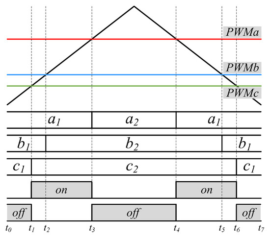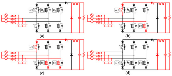 The operation of the buck rectifier can be classified into the on and off states, which is similar to the DC-DC buck converter [17]. The switching modulation scheme with two operating states and operating modes are shown in Figure 6 and Figure 7, respectively. Similar to the DC-DC buck converter, both the on and off states are needed to step down the output voltage. The off state occurs when the switches a1, b1, and c1 or a2, b2, and c2 are turned on. In this state, the current only passes through the freewheeling diode, as shown in Figure 7a,d. The input current from the AC grid cannot flow due to the diodes. Therefore, the current at the thyristor is zero at this state, which can turn off the thyristor. The other region is the on-state, where the current flows from the AC grid to the output stage, as shown in Figure 7b,d. The on- and off-states are formed alternately during the operation. Therefore, the thyristor can be completely turned off at the off-state once the turn-off signal is generated. If the thyristor is attached in the other place except the position shown in Figure 4, the thyristor cannot be turned off because the current still flows through the thyristor.