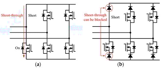 Shoot-through fault on bridge topologies: (a) boost-type rectifier, (b) buck-type rectifier.