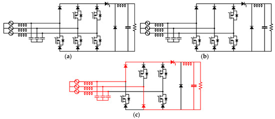 To implement the DC distribution system, as shown in Figure 1, an AC-DC rectifier is required to be interfaced with the conventional AC grid, and to convert the AC grid voltage to the DC-bus voltage. The conventional AC-DC rectifiers are based on a boost-type topology [4,5,6]. To decrease total harmonic distortion (THD) of the grid current, a t-type topology was developed in [7]. For high voltage applications, a three-level rectifier, which can reduce the voltage stress to half, was introduced in [8]. Their voltage range is always higher than the AC grid voltage level. For example, a 380 V DC distribution system cannot be obtained from a three-phase 380 V by using a boost type AC-DC rectifier. Consequently, if the DC-link voltage needs to be lower than the AC grid voltage, additional line-frequency transformers or power converters are required. It eventually decreases the power conversion efficiency and cost-effectiveness of the DC distribution system.