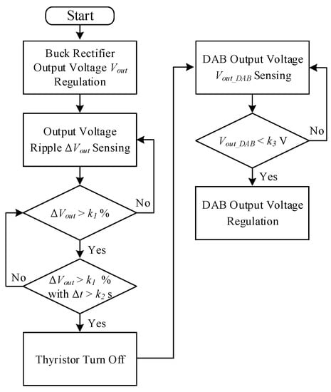 To successfully stabilize the DC-link voltage under the fault conditions, the protection algorithm of the buck rectifier and the DAB converter is proposed in Figure 11. When the switch of the buck rectifier has the short-fault, the faulty bridge loses its controllability and the output voltage ripple is increased. Therefore, in the first protection process of the proposed algorithm, the output voltage ripple is used to detect this fault condition. If the output voltage ripple increases at a certain point, the thyristor is turned off to protect the output stage. In the case of the load transient, which can increase the voltage ripple, the output voltage ripple detection collects the voltage ripple data during a specific time to determine the on- of off-state of the thyristor. After the thyristor is turned off, the output voltage starts to decrease due to the absence of the power source. When the output voltage is decreased to a specific voltage level, the DAB converter supplies the electric power from the battery to the output stage to regulate the DC-bus voltage.