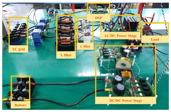 The specifications of a 3.6-kw prototype converter are listed in Table 1. The experimental setup is shown in Figure 12. The line-to-line grid voltage connected to the input of the converter is 220 V. In the case of the diode rectifier or the boost-type AC-DC converter, the regulated minimum output DC voltage level is 311 V. However, under the proposed system configuration, the DC output can be regulated by stepping down to 110 V, which is the target voltage level. The buck rectifier is connected to the AC grid, and the DAB converter is interfaced between the output stage and the battery to operate as the UPS. The PWM signals and the protection algorithm are implemented by a digital signal processor of TMS320F28335 manufactured by Texas Instrument (TI).
