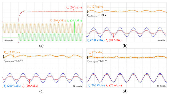 Figure 13 shows the experimental results of the buck rectifier. Va, Ia, and Vout are the grid input voltage, grid input current, and output DC voltage, respectively. In Figure 13a, the output voltage of the buck rectifier is well regulated to 110 V. The steady-state waveforms under various load conditions are depicted in Figure 13b–d according to the output power. The input grid current is regulated to have the same phase with the grid voltage for the unity power factor and the low THD. The measured power factor and THD of Figure 12d is 0.99% and 9.2%, respectively. In the condition of Figure 13, the power switches are not under the fault condition. The output voltage ripples are less than 2 V in the normal condition; however, the voltage ripples are expected to increase under the faulty cases.