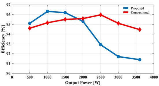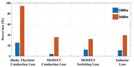 The power conversion efficiency curves of the proposed buck rectifier and the conventional voltage source inverter are shown in Figure 14. The blue circle marked curve and the red diamond marked curve shows the efficiency of the proposed buck rectifier and the conventional voltage source inverter, respectively. In the proposed buck rectifier, the peak efficiency is 96.324% at 1000 W, and the overall efficiency is higher than 91%. The efficiency decreases as the output power rises because of the conduction loss increment. Figure 15 shows the loss breakdown at 1000 and 3600 W. As seen, the conduction loss of the MOSFET at 3600 W is bigger than that of 1000 W compared with the other power losses, which decreases efficiency as output power goes up.