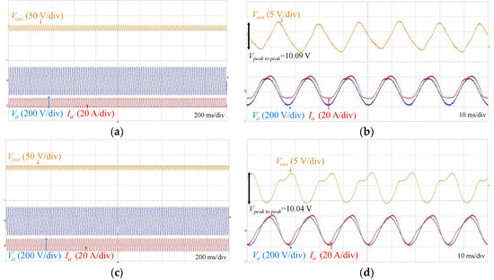 Figure 16 shows the output voltage regulation under the switch fault conditions. A single switch a1 and two parallel switches a1 and b1 are shorted to make the fault situation in Figure 16a,c, respectively. Even if the switches are shorted, the series-connected diodes can block the shoot-through so that the output voltage is not collapsed. The shorted switches cannot be controlled; however, other normal switches can still be controlled by the modulation algorithm shown in Figure 5. Therefore, in Figure 15a,c, the output voltage is well regulated to 110 V, but the voltage ripples are increased from 2 (shown Figure 13) to 10 V, as shown in Figure 16b,d. These experimental waveforms verify that the level of the voltage ripple can be used as an indicator to detect the fault conditions, which are used for the proposed protection algorithm.