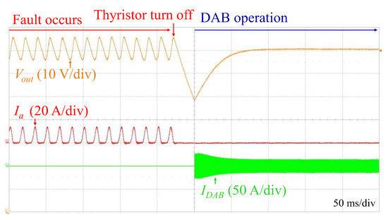 Figure 17 shows the operation of the buck rectifier with the DAB converter under the switch fault condition. As shown in the left side waveforms of Figure 17, the output voltage can be regulated under the switch fault condition within 10 V peak-to-peak voltage ripples. After the detection of this fault, the thyristor is turned off by using the proposed protection algorithm. This fault condition is the same as that of Figure 16a. After the faulty circuit is isolated from the AC grid, the output voltage naturally decreases. When the output voltage is decreased to 90 V, the DAB converter operates as the UPS to supply the electric power to the DC grid. Then, the output voltage is recovered to 110 V within 60 ms by the voltage regulation of the DAB converter. Consequently, shown in Figure 17, the output voltage can be properly regulated under the high reliability guaranteed by the proposed buck rectifier, the series-connected thyristor, and the protection algorithm, even if the switch fault occurs in the proposed system.