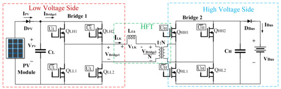 Figure 2 shows the circuital scheme of the DAB converter, where is the source at the low-voltage side (LVS) of the high-frequency transformer (HFT) and is the load voltage at the high-voltage side (HVS). Bridge 1 and 2 use four transistors: to and to . Each bridge can operate in inverter or rectifier form depending on the direction of the power flow, i.e., when the power flows from to , bridge 1 works as inverter and bridge 2 works as rectifier; in the other power flow direction the bridge roles change. For PV applications the bidirectionality is not used since the current injection into the PV panel must be avoided, therefore this current flow must be restricted with both diodes and control systems.