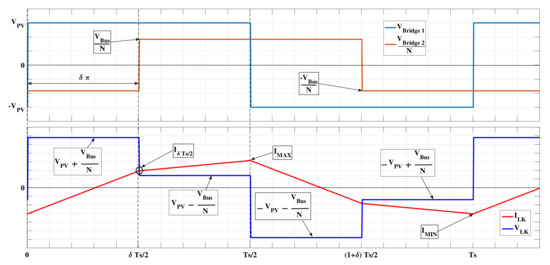 To analyze the behavior of a DAB converter, Figure 3 shows a simplified version of the circuit referred to the transformer primary side, where a square voltage source models the behavior of both PV module and bridge 1, while divided by N represents the secondary voltage, referred to the primary side, imposed by both the bridge 2 and DC bus. Figure 4 depicts the steady-state waveforms of voltages and considering a phase shift between those signals. The leakage inductor voltage , obtained by subtracting and , and the leakage inductor current are also reported in Figure 4. Both voltage and current of the leakage inductor are AC signals without DC component, and those waveforms depend on the bridge voltages and phase shift. The figure shows that is a symmetrical signal with respect to time axis; therefore, due to the flux balance on steady-state conditions, the peak value on the positive section of is equal to the peak value of the negative section, i.e., . The bridge 1 on the DAB converter can operate in buck mode if is higher or equal than , or in boost mode when is higher than . In buck mode, the peak current of the leakage inductor takes place in the middle of the switching period , but in boost mode that peak occurs at as reported in [32].