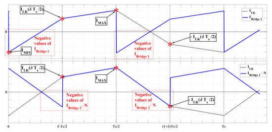 Such an expression must be evaluated for the SPS modulation [51], which means: there is not phase shift between transistors and from bridge 1, hence ; and there is not phase shift between transistors and from bridge 2, hence . Therefore, the RMS value of the leakage inductor current becomes: