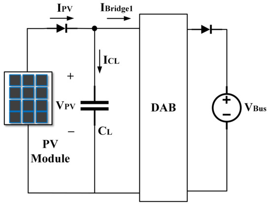 For the specific power flow direction, current and are plotted in Figure 5, which shows that both currents have positive and negative values, but the average values of those signals are different from zero. Moreover, if or , the average current value in both bridges is zero, which means that there is not power transfer between the bridges, i.e., based on Equations (1) and (2). Negative values in the bridge currents cause problems to unidirectional sources and loads, e.g., a PV module. Therefore, diodes have to be inserted at the input and output terminals of DAB converter, as seen in Figure 2, to avoid current injection into the PV module. For that reason, the diode was inserted between the solar panel and the input capacitor of the DAB converter, thus negative values of flow through instead of the PV source. In the same way, a diode was inserted between the DC bus and the output capacitor of the DAB converter , which prevents current extraction from the load; instead, negative values of flow through .