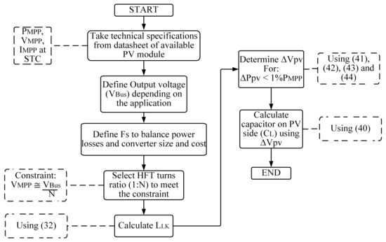 Figure 8 presents a synthesis of the proposed design method for the DAB converter using a flowchart. The first step is to extract the parameters of the PV module at STC from the manufacturer datasheet; the STC data are used because at those 25 C and W/m the maximum PV current occurs. That information is used to calculate the parameters of the single-diode model used to reproduce the PV module behavior, which is necessary to calculate the value of the PV side capacitor . Then, the DC bus voltage is defined by the application, and the switching frequency must be selected taking into account that higher reduce the size of the transformer and passive elements on the converter, which is desirable to provide high power density and lower cost. However, taking into account that the switching losses on power converters increase linearly with the switching frequency [52], must be selected to provide a positive balance between power losses and converter size and cost. Next, the selection of turns ratio of the HFT is made to fulfill the restriction , which is needed to obtain the lower peak value of , as it is described in [31,32], to produce the lowest current stress and the highest efficiency for the SPS control. Then, is calculated using (32). Subsequently, the PV voltage ripple is calculated solving (41)–(44) to provide the acceptable value of the PV power ripple . Finally, parameter is calculated using (40).