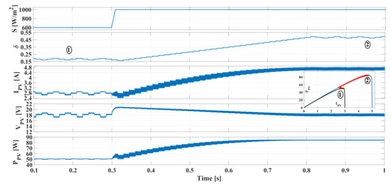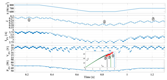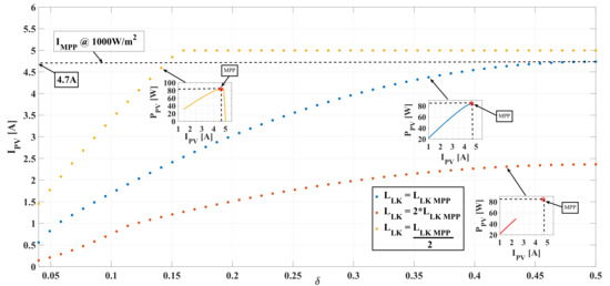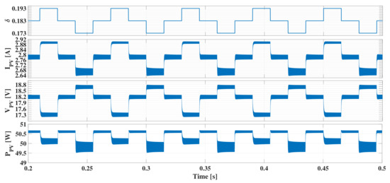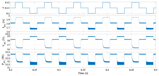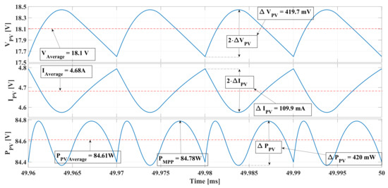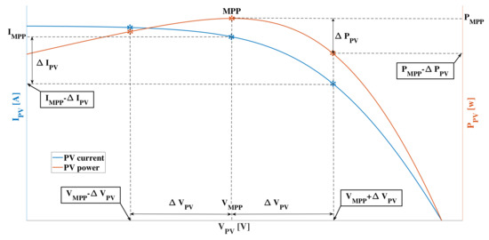 The selection of depends on the value. Figure 9 shows the behavior of the PV power and current around the MPP of a PV module: at the MPP, the module voltage is , the current is , and power is . If the PV voltage is increased due to the voltage ripple, i.e., the operating point moves to the right side of the curve, there is a reduction in the PV current. On the contrary, if the operating point moves to the left side, the PV current is increased. Instead, on the PV power curve, the movement at both sides of the MPP voltage causes a power reduction, which is higher when the voltage increases due to the always negative PV current derivative [54]. Figure 9 illustrates the current ripple and power ripple caused by the PV voltage ripple at both sides of the curves.