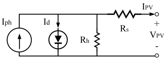 The PV current is calculated using the single-diode model of the PV module reported in [54], which circuital representation is presented in Figure 10; the corresponding equation is reported in (44), where depends on the photo induced current , diode saturation current , ideality factor , and series and parallel resistances, and . Such an expression allows calculation of at any voltage.