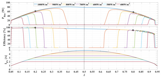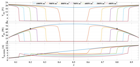 In conclusion, since the PV current Equation (18) is symmetric with respect to , but the square of the RMS value of the leakage inductor current is higher in the range , the DAB converter connected to a PV module must be operated in the range to provide lower ohmic losses in the transformer, which ensures higher efficiency: for example, the same PV current occurs for and , but lower conduction losses will occur for . Therefore, the phase shift will be restricted to .