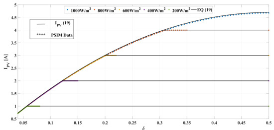 The last step is to evaluate (18) with the variable replacement , which leads to the same Equation (18). Therefore, the symmetry of (18) with respect to is demonstrated. Such a condition imply that the same PV current is obtained for both and values, e.g., the same PV current occurs for and . Therefore, it is enough to operate in the range or in the range .