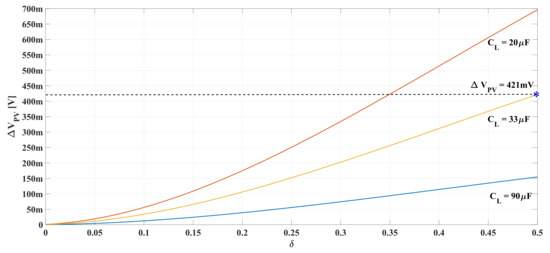 Therefore, Equation (44) must be used to calculate (43), and is calculated to produce the acceptable solving (42) and (41). In this work, is selected to be lower than the power ripple introduced by the Perturb-and-Observe () MPPT algorithm, which is needed for a stable operation of the PV system [55]. Finally, considering that a typical algorithm provides efficiencies around [56,57,58,59], then must be lower than i.e., .