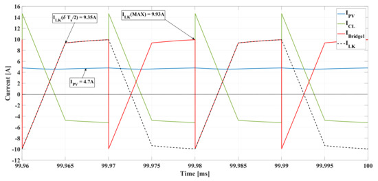 The capacitor charge balance establishes that in steady-state operation, the net change of charge over one switching period must be zero, hence the average capacitor current in steady-state must be zero [52]. Applying the charge balance to in the DAB converter, i.e., when the average value is equal to zero , enables the obtaining of the average values of (3) as reported in (6). Such an expression shows that the PV current depends on the inductor leakage current.