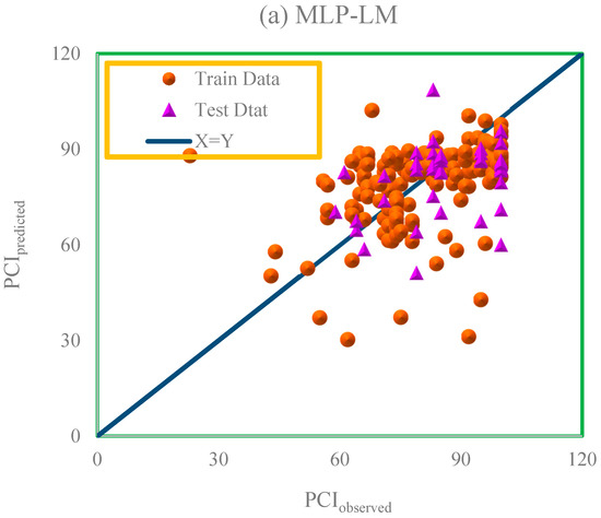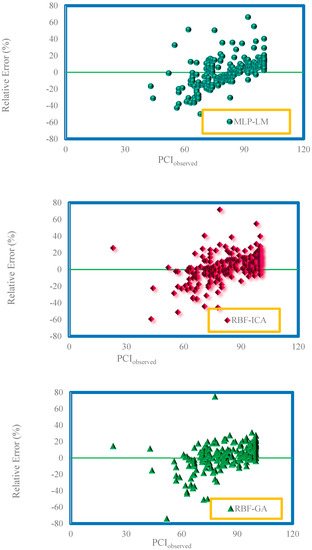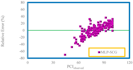Figure 6 reveals the relative error distribution curves. In general, and for each model, the closer the data points are to the horizontal line of zero error, the greater the accuracy of the model is. According to Figure 6, the highest relative error between PCIobserved and PCIpredicted in the CMIS model is less than 33%, which is superior to other models. Thus, Figure 6 also confirms the greater accuracy of the CMIS model compared to other models.