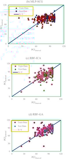 To implement the proposed method, the authors selected 236 pavement segments from Tehran-Qom freeway in Iran. First, PCI was calculated by inspecting all segments and recording surface distresses data. Then, all the segments were subjected to FWD testing and the average deflection of each segment was determined. After completing the database, the analysis stage was carried out with the help of machine learning (ML) techniques. ML techniques are a sub-category of computational intelligence. These techniques are chiefly applied for function approximation, classification, pattern recognition, etc. [17]. ML algorithms have recently gained popularity in PMS studies [18,19,20,21,22,23,24,25,26,27,28,29]. In this paper, multi-layer perceptron (MLP) and radial basis function (RBF) neural networks were used for data analysis. The optimization of MLP neural network was conducted by Levenberg-Marquardt (LM) and scaled conjugate gradient (SCG) algorithms and the RBF neural network was optimized by the genetic algorithm (GA) and imperialist competitive algorithm (ICA). Therefore, the analytical methods used in this paper are MLP-LM, MLP-SCG, RBF-GA and RBF-ICA. Finally, to obtain more accurate results, all four methods were merged with committee machine intelligent systems (CMIS) in a single model. The results of these five methods were assessed using average percent relative error (APRE), average absolute percent relative error (AAPRE), root mean square error (RMSE) and standard error (SE) criteria to determine the accuracy of each method.