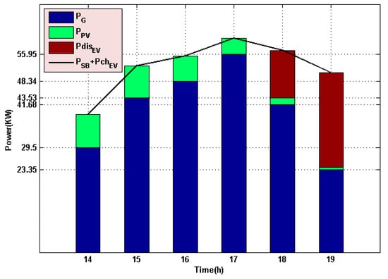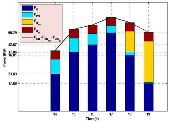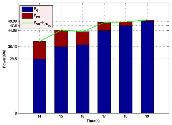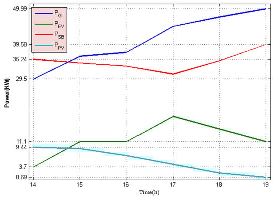 For validation of the developed MBLP optimization model, first, the base scenario is considered in which the EVs continue with their charging process until they reach 65% of their maximum capacity. Figure 2 shows the power curves of the building resource, as well as the electricity consumption from the power grid () in the analyzed period, which is the base value used for comparison with the other scenarios, where is the power from EVs, PSB the power from BESS, and the power from solar PV generation.
