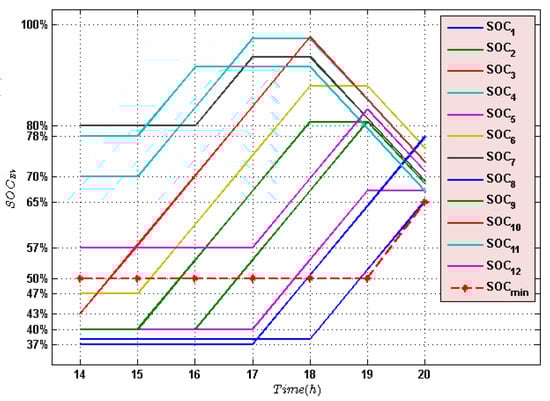 It is necessary to set the following restrictions to assure that the physical limitations of the storage capacity of the EVs batteries are not violated. The updated formulation of SOC for each EV i = 0, 1, …, I−1 is defined by the following constraint