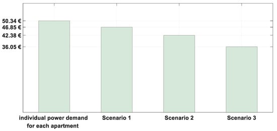 When carrying out an economic analysis, the data from scenarios 1, 2, and 3 were submitted to a time-of-use (TOU) tariff structure, in accordance with the Portuguese legislation. Therefore, the possibility of the building contracting a single power to meet all its electricity demand was considered, assuming a penalty for overtaking and a bonus for users that adhere to DR calls. With this, it was possible to obtain a reduction up to 28% in the cost of electricity, as shown in Figure 9.
