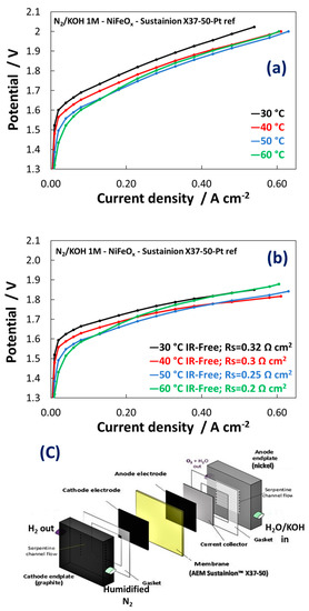 - Liu, Z.; Sajjad, S.D.; Gao, Y.; Kaczur, J.; Masel, R. An Alkaline Water Electrolyzer with Sustainion™ Membranes: 1 A/cm² at 1.9V with Base Metal Catalysts. ECS Trans. 2017, 77, 71–73. [Google Scholar] [CrossRef]