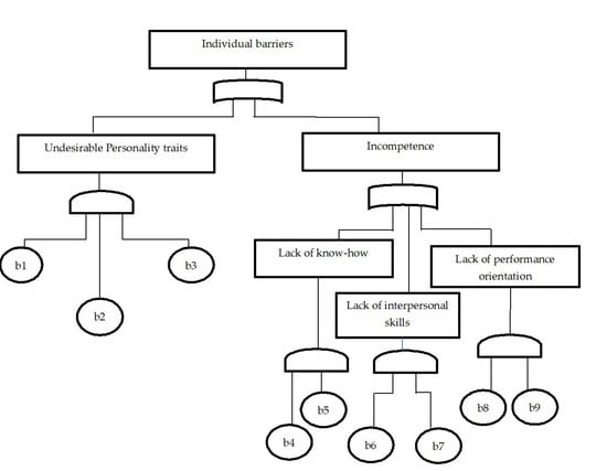 A cursory examination of Figure 3 indicated that undesirable personality traits and incompetence dominated individual barriers. Drilling down into the personality traits element exposed three common factors, namely: Agreeableness, conscientiousness, and openness. All three common factors recorded similar scores which buttresses the importance of combining these traits in order to obtain desired results. In addition, [,,,] have claimed that personality traits have huge impacts on how individuals share work related knowledge, expertise, and contributions within an organisation. Moreover, competence is indicated by having the necessary practical/technical skills along with a high awareness of strategic business orientation. However, deficiencies in any of the elements could independently lead to the undesired top-level event because only experienced staff can effectively transfer residual (tacit) knowledge. That is, if an experienced staff (defined by their virtue of long term involvement in MoOSTs) is deficient in any combination of limited interpersonal skills, (including communication skills—verbal or written), as well as having undesirable personality traits that restricts people from seeking them out for the skills they possess, (i.e., ranked low on openness, agreeableness, and contentiousness), then potential barriers for knowledge sharing increases. Consequently, if all of these desired factors are missing, less experienced or inexperienced staff would be unable to benefit, which raises the likelihood of tacit knowledge flow, which consequently results to over-reliance on explicit knowledge.