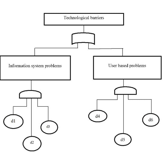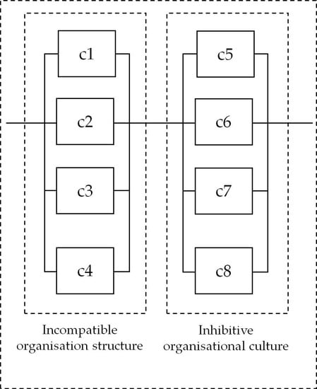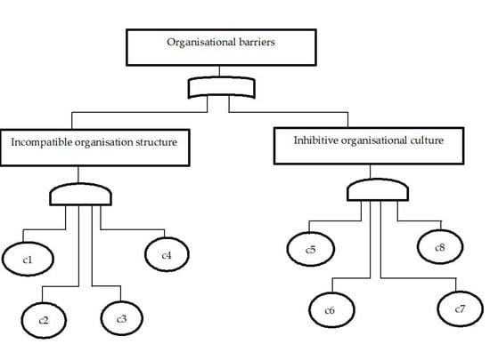 In general, there were nine, eight, and six subcriteria related to individual, organisational, and technological barriers as shown in Figure 7. The most highly ranked subcriteria were all associated with organisational barriers especially c4, c6, c7, and c8 (Table 7). The next highly ranked subcriteria were related to individual barriers which were most influenced by b4 and b5 (Table 6). Technological barriers were the least ranked, with lack of adequate training (d5) on newly deployed technologies being the most influential (Table 8). The dominance of organisational barriers adequately aligns with the findings of earlier studies [,,] that clearly advocate the need to revisit existing practices to knowledge management within organisations. Further dissection of the intermediate events associated with organisational barriers revealed that incompatible organisation structures and inhibitive organisation culture as the main root causes.