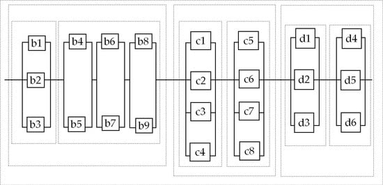 RBD is a method based on representing a system by interconnected blocks (i.e., series, parallel or combinations). The connections between individual blocks signifies the influence on the reliability of an entire system []. In systems’ reliability analysis, a system is depicted as being in series, if it fails when one or more components fail. On the other hand, a system is depicted as parallel if only simultaneous failure of multiple components leads to system failure. RBDs are particularly concerned with different combinations of components within the system that will lead to system functionality, which is its main distinction with the FTA that solely focuses on system failure combinations [,]. The overarching purpose of developing equivalent RBDs is an attempt to visualise relationships of causal factors that can lead to identification of vulnerabilities and/or resilience within a system. Despite its usefulness, RBDs have been criticised for their overreliance on near perfect (which is often unrealistic in all circumstances, especially when dealing with unfamiliar problems) FT outputs in order to generate accurate results []. Detailed and clear guidelines for constructing RBDs, as well as their conversion to FTs and vice versa are available in [], while [] further demonstrates real-life implementations. Typical RBD symbols and their associated interpretations are provided in Table 2.