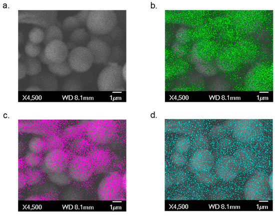 SEM/EDS images of the Ti(1,8-DHAQ)2 microparticles. (a) Background SEM image. (b) EDS mapping of carbon in green. (c) EDS mapping of oxygen in magenta. (d) EDS mapping of titanium in blue.