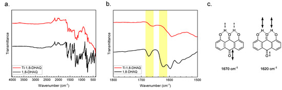 (a) Infrared spectra of Ti(1,8-DHAQ)2 (red) and 1,8-DHAQ starting material (black). (b) Expanded view of the carbonyl stretching bands demonstrating a decrease in the peak at 1670 and 1620 cm−1 upon metal binding. Molecular structures of the 1,8-DHAQ starting material are shown in (c), with the vibrational modes shown with the corresponding energies as determined by density functional theory (DFT) calculations.