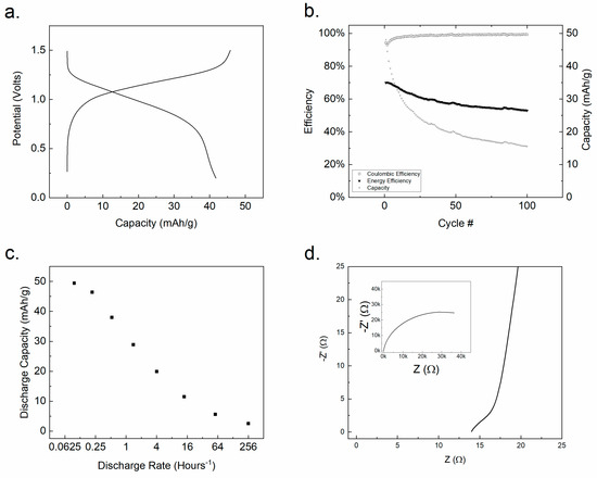 Electrodes prepared from Ti(1,8-DHAQ)2 were tested against a LiMn2O4 (LMO) positive electrode in an aqueous coin cell. LMO was chosen as a positive electrode material in aqueous electrolyte based on literature precedent and commercial availability. Lithium sulfate was chosen as an electrolyte in part due to the poor performance of aqueous sodium-based electrolytes with the LMO electrode [69]. The battery was charged and discharged to test capacity and stability. LMO | Ti(1,8-DHAQ)2 batteries were charged and discharged with a C-rate of C/2.5, as shown in Figure 4a and produced a coulombic efficiency of 89%. The resulting nominal voltage of the battery is approximately 1.1 V.