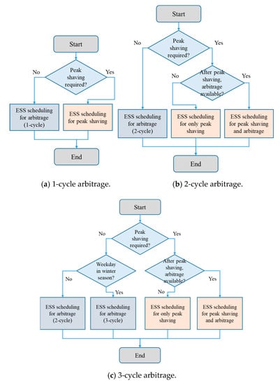 Figure 1 shows a flowchart of the operational strategy of customer-installed ESS using the peak shaving and arbitrage operations with different daily charge-discharge cycles in South Korea. These strategies commonly prioritize peak shaving operations compared to arbitrage operations, since the demand charge saving from peak shaving is more efficient than the energy charge saving from arbitrage []. Dozens of days are usually expected to exceed the peak reference during a year. For these days, the single-cycle operation performs the only peak shaving as shown in Figure 1a. However, the multi-cycle operations can choose the full peak shaving or the combined operation of the early peak shavings and the late arbitrages when late arbitrages are available after finishing the peak shaving as described in Figure 1b,c. For the other days not exceeding the peak reference, the ESS only performs the arbitrage operation. For these days, the multi-cycle operations can choose merely the 2-cycle operation for all weekdays (Figure 1b) or the 2-cycle for weekdays in non-winter and the 3-cycle for weekdays in winter (Figure 1c).
