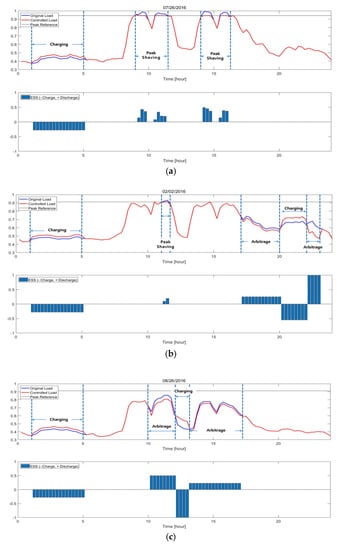 The operational algorithm of customer-installed ESS is divided into a peak shaving operation and an arbitrage operation. The peak saving operation reduces an annual peak load of customers with discharge of their ESS. This algorithm sets the peak reference based on consideration of ESS capabilities of energy storage and charge/discharge rates, and the ESS maintains the annual peak to not exceed the peak reference. The arbitrage utilizes differences of energy usage charge rates. This algorithm saves the customers’ energy usage charge by charging their ESS during the hours of the relatively lower usage charge rate and then discharging the energy during the hours of the relatively higher usage charge rate []. The daily charge-discharge cycles for the arbitrage operation can be selected to a single cycle (1-cycle) or multiple cycles depending on the TOU schedules. The South Korean TOU tariff structure is divided into on-peak (highest rate), mid-peak, and off-peak (lowest rate) load hours as described in Table 2. According to the rate schedules in Table 1, the daily maximal arbitrage cycle is two on weekdays in non-winter (morning off-peak and on-peak discharging and afternoon mid-peak and on-peak discharging) and three on weekdays in winter (morning off-peak charging and on-peak discharging, afternoon mid-peak and on-peak discharging, and night mid-peak and on-peak discharging).