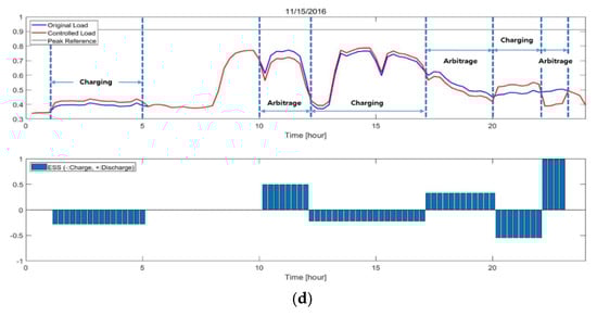 Examples of Daily ESS operations: (a) only peak shaving, (b) combined operation of peak shaving and arbitrage, (c) only arbitrage with 2-cycle, and (d) only arbitrage with 3-cycle.