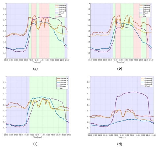 The simulation utilizes actual load profiles accumulated by four different customers (Customers A, B, C, and D) using the TOU tariff structure. These load profiles are 15-minute-based data measurements by KEPCO from January 1 to December 31, 2016. In addition, the load profiles are normalized by their peak load for effective comparison of the customers. Figure 3 shows normalized seasonal average load profiles for Customers A, B, C, and D for (a) weekdays (non-winter), (b) weekdays (winter), (c) Saturdays, and (d) Sundays and holidays. In the case of weekdays, the daily averaged loads of Customers A and B show the ‘M-shaped’ pattern, the representative profile of manufacturing industries, while the daily averaged loads of Customers C and D show the ‘square wave-shaped’ pattern, the typical profile of commercial buildings. Customers A and B use Industrial Service B (High-Voltage B, Option Ⅱ) and Customers C and D use General Service B (High-Voltage A, Option II).