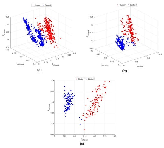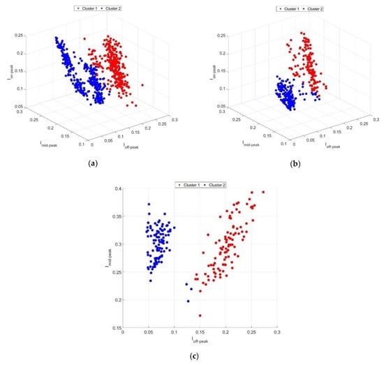 The internal evaluation parameters based on the K-means approach are observed to determine the optimal cluster number. Table 4 shows DBI, SI, and DBI-SI values by increasing the cluster number from 2 to 5. The optimal cluster number is selected to be 2, since the cluster number 2 shows the highest values of SI-DBI for Weekdays (non-winter), Weekdays (winter), and Saturdays. Figure 4 shows the clustering result of the K-means approach when the cluster number is 2. This demonstrates that most data from Customers A and B are classified into Cluster 1, otherwise, most data from Customers C and D are classified into Cluster 2 for Weekdays (Non-winter), Weekdays (Winter), and Saturdays. Table 5 shows the ARI-based external evaluation of K-means when the cluster number is 2. The total ARI value is calculated to 0.919, which can be evaluated as the ‘excellent’ clustering result. Figure 5a describes the separated data distributions of Clusters 1 and 2 for Weekdays (Non-winter) with 0.890 of the ARI value, which can be evaluated as the ‘good’ result. The results of Weekdays (Winter) show the relatively lower ARI value (0.797) compared to that of Weekdays (Non-winter). This is due to the relatively closer center points between Clusters 1 and 2 as described in Figure 5b, and, consequently, the failure rate of clustering is relatively increased. For Saturdays, Figure 5c indicate a significant separation between the two clusters with the highest ARI values (0.942).