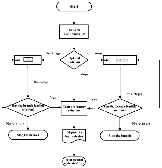 In this section, we solve the proposed nonlinear model by using the RQP method. To prove the effectiveness of the RQP to achieve optimality, the obtained objective value is compared to the one found by solving the Integer Linear Programming (ILP) model with binary-valued variables for each benchmark test system. The pure ILP model is solved by using the BBM. In this method, a relaxed continuous linear programming (LP) problem is formulated by ignoring the integer constraints. The relaxed problem is comprised of continuous variables. If the solution to the above relaxed continuous problem contains only involves integers, it is the optimal solution. If the solution has non-integer variables, one non-integer variable is selected and two sub-problems (two branches) are generated [39,40]. For one of them, a ceil constraint is added to the selected non-integer variable and, for the other branch, a floor constraint is added to it. If a branch has no feasible solutions, this branch is terminated [39,40]. If the solution only has integers, it becomes a candidate for the final optimal solution. If the solution has non-integer values, the process of the branching is again solved with these additional constraints. Once the branching process is completed for all the variables, all the integer solutions obtained by the difference branches are compared. The best solution is considered the final optimal solution as shown in the flowchart of Figure 3.