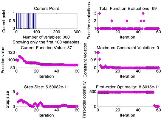 The function evaluations lead to a feasible global solution point, whereas the constraints are satisfied within tolerances. The fmincon/RQP optimizes the tuning parameters i.e., TolX, TolFun, and TolCon to converge to global optimality whereas the binary restriction is satisfied.