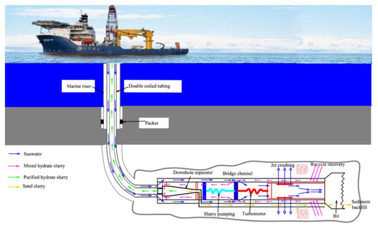 Natural gas hydrate (NGH), also named as “Flammable Ice”, is considered to be an alternative clean energy source in the 21st century because of its huge reserves [1]. The total amount of NGH resources in the world is about 3 × 1015 m3, most of which is stored in the ocean [2,3,4]. According to the types of accumulation, marine NGH can be divided into four types: the sandstone NGH reservoir, non-sandstone NGH reservoir, seafloor mounds NGH reservoir, and disseminated NGH reservoir [5]. Sandstone NGH reservoirs, which have a relatively high porosity and are easy to exploit, are usually selected for production tests [6,7,8]. Disseminated NGH reservoirs, although accounting for more than 90% of the total NGH reserves, are difficult to exploit with the current technology because of low permeability [9]. The NGH resources in the South China Sea are about 85 trillion m3 [10]. However, they belong to the disseminated NGH reservoir type, and its matrix is mainly composed of clay and silty sand. The characteristics of hydrate in the South China Sea can be summarized as low permeability, shallow burial, and poor cementation. Although so many methods, such as heat injection, depressurization, chemical injection, carbon dioxide replacement, and solid fluidization, have been proposed, and are expected to be used in hydrate production [11,12,13,14]. However, for marine disseminated NGH reservoirs, only the depressurization method and the solid fluidization method have been technically verified by the offshore production test in the South China Sea in 2017 [14,15]. In the process of the production test with depressurization method, hydraulic slotting technology is used to solve the problem of the low permeability of the disseminated NGH reservoir [16]. The solid fluidization method is a new NGH production method, and its process is shown in Figure 1 [17]. First, a small borehole is drilled with coiled tubing. Then the NGH sediment around the borehole is broken into fine particles by water jet technology. After mixing with water, particles of hydrate, clay, and sand form slurry. Under the action of in situ separator, clay, and sand particles are separated and backfilled. Hydrate particles are transported to the ocean surface through the riser for further treatment [18].