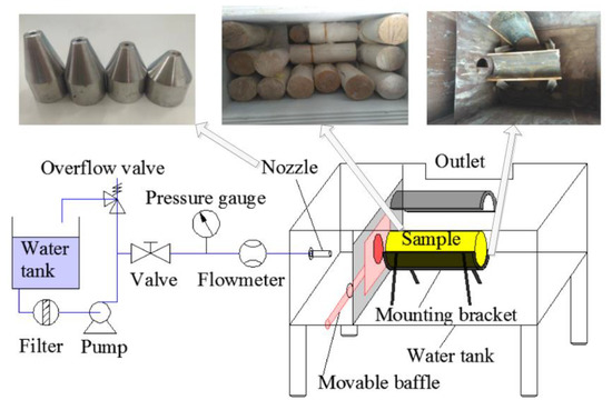 As shown in Figure 2, the experiment apparatus mainly includes a water supply tank, pump, flowmeter, pressure gauge, experimental water tank, and nozzle. The volume of the water supply tank is 4.5 m3. The pump is a plunger pump with the maximum working pressure and displacement of 30 MPa and 200 L/min, respectively. The measuring range of pressure gauge is 0–40 MPa at a 0.1 MPa precision, and the measuring range of flowmeter is 2–20 m3/h at a 0.02 m3/h precision. The function of the experimental water tank is to ensure that the jet is submerged. A movable baffle is installed in the water tank between the nozzle, and the experimental sample to avoid erosion of the sample while adjusting the test pressure. The type of nozzles used in the experiment is the cone straight type. The length of the cone angle section and the straight pipe section of a nozzle are the same, which are three times of nozzle diameter. The cone angle is 13°.