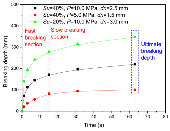 For each jet breaking experiment, the sample breakage depth when the jet water could not break into the experiment sample any further is defined as maximum breaking depth. The time it takes to achieve the maximum breaking depth is the ultimate breaking time. Since the experimental sample is made of frozen soil, although the sample is submerged in the water tank to maintain low temperature, it should not be exposed to above zero degrees centigrade ambience for an excessive time. During the jet breaking process, the major breakage happens in the early stage for a short period of time, and, as the jet breaking proceeds, the breaking rate becomes low and breaking depth changes very little. Therefore, based on the correlation of breaking depth and time, the breaking depth that barely changes with time is approximately regarded as the maximum breaking depth, and the corresponding time is considered the ultimate breaking time. Figure 3 shows the variation of breaking depth with breaking time under various experimental conditions. As the jet breaking process proceeds, breaking depth increases with time, and breaking depth increase slows down with time. The first 0–15 s is the fast-breaking section, during which breaking depth increases rapidly. The following 16–63 s is the slow-breaking section during which breaking depth increases slowly. Comparing the breaking depth and time correlations under three experimental conditions in Figure 3, it was found that, given the same jet breaking time, the larger the breaking depth, the more significant breaking depth increases during the slow-breaking section, so a longer breaking time is needed to achieve the maximum breaking depth. Among all the NGH jets breaking experimental conditions, sample saturation of 20% (lowest), jet pressure of 10 MPa (highest), and nozzle diameter of 3.0 mm (largest) lead to the largest breaking depth, and thus results in the longest ultimate breaking time. Under this experimental condition (Sn = 20%, P = 10 Mpa, Dn = 3.0 mm), average breaking rate (the rate of breaking depth increase is defined as breaking rate) during the fast-breaking section is 18.6 mm/s, and the average breaking rate of the slow-breaking section is as low as 1.4 mm/s. Breaking rate slows down further after the slow-breaking section, so the breaking depth increase after slow-breaking section is negligible. Therefore, based on the breaking depth vs. time curve of the experiment under sample saturation of 20%, jet pressure of 10 MPa, and nozzle diameter of 3.0 mm, 63 s is considered ultimate breaking time. The jet breaking process is conducted for 63 s for the following experiments.