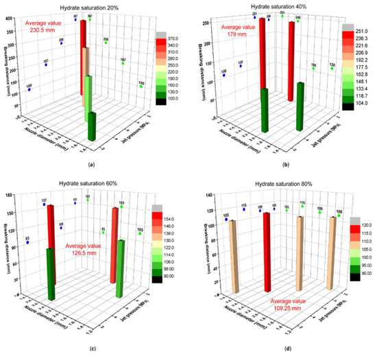 Ultimate breaking distance, the summation of the target distance (the initial distance between the nozzle and the experimental sample prior to the NGH water jet breaking process, 20 mm) and the maximum breaking depth, is an important parameter to determine the critical water jet breaking velocity. Figure 4a,d shows the variation of the ultimate breaking distance with nozzle diameter and jet pressure when the sample saturation was 20%, 40%, 60%, and 80% respectively. The average ultimate breaking distances corresponding to 20%, 40%, 60%, and 80% sample saturations were 230.5 mm, 179 mm, 126.5 mm, and 109.25 mm, respectively, which suggests that the higher sample saturation, the shorter the ultimate breaking distance.