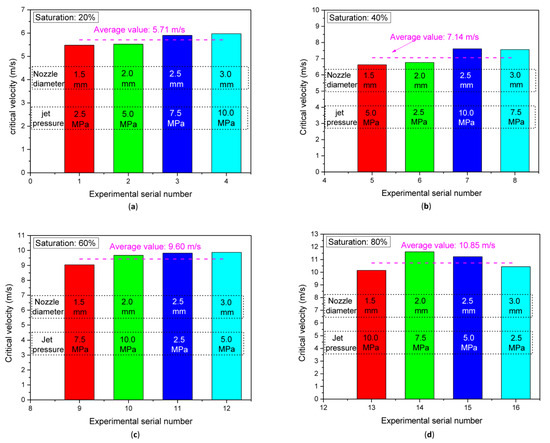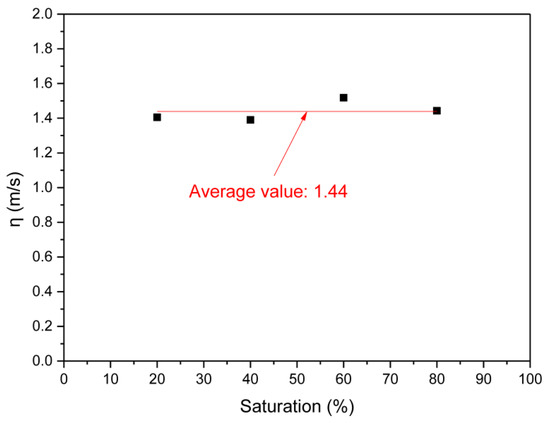 Substituting the experimental data to Equation (7), the characteristic velocity η was calculated, as shown in Figure 6. Corresponding to the NGH saturation of 20%, 40%, 60%, and 80%, η was calculated to be 1.41 m/s, 1.39 m/s, 1.52 m/s, and 1.44 m/s, respectively. Values of η calculated with various saturations are close, which proves that the critical water jet velocity formula is correct. Average critical water jet velocity under various saturations is 1.44 m/s.