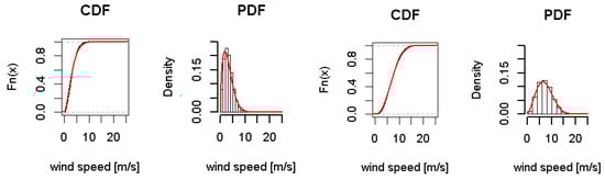 As an example, Figure 3 shows two approximated Weibull distributions for station 43, in the Middle of Germany, and station 49, in the North of Germany. The stations are marked in a light blue in Figure 2.