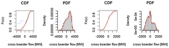 Interconnected TSOs exchange energy with neighbouring TSOs. Germany, as part of the Continental European grid, is influenced due to physical CBF. The ENTSO-E publishes hourly values for CBF. In the analysis the data for the years 2012 to 2014 are taken. The data consist of around 25,000 data. Similar to the solar irradiance distribution, no categorization into one-parametric family is possible. The kernel density estimator estimates the CBF. The bandwith is estimated by cross-validation likelihood. Nowadays, Germany (DE) exchanges energy with Austria (AT), Switzerland (CH), Czech Republic (CZ), Western Denmark (DK1), Eastern Denmark (DK2), France (FR), Luxembourg (LU), Netherlands (NL), Poland (PL), and Sweden (SE). In Figure 5, the CBF between DE and CH and between DE and DK1 are presented.